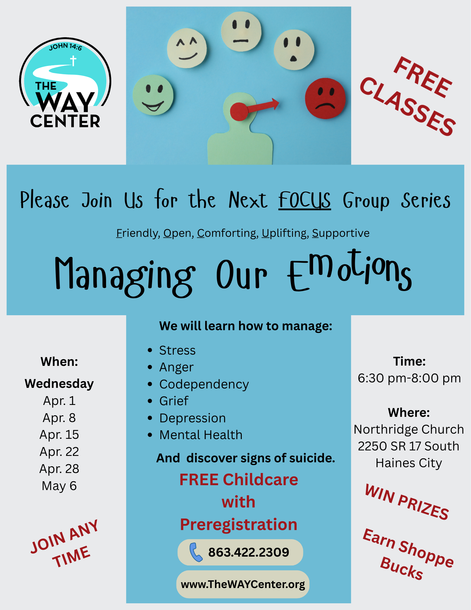 We will learn how to manage: Stress Anger Codependency Grief Depression Mental Health And discover signs of suicide. Call 863.422.2309 for more information or to register.